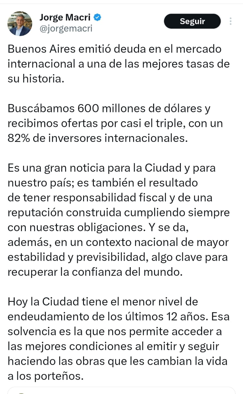 El jefe de Gobierno porteño, Jorge Macri, afirmó que la Ciudad de Buenos Aires logró una de las mejores tasas de su historia en la reciente colocación de deuda en el mercado internacional. Según informó, la administración buscaba financiarse por USD 600 millones, pero recibió ofertas por casi el triple, con una participación del 82% de inversores internacionales.